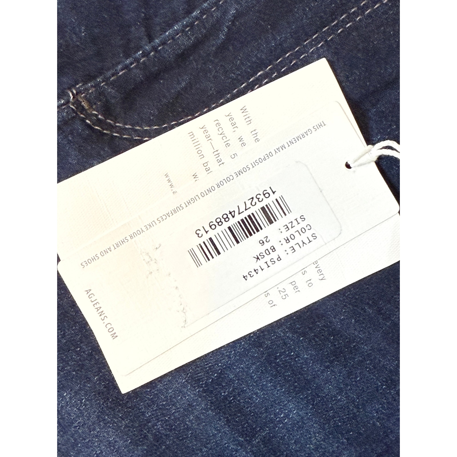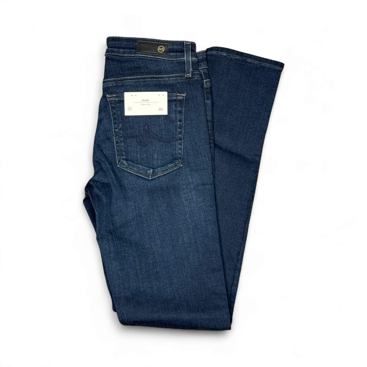 AG Jeans Prima Cigarette fit in dark blue wash. Mid-rise, slim fit, size 26. Brand new with tags, premium stretch denim with fading and whisker details.