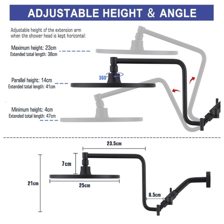 10" Rainfall Shower Head with Handheld Combo, Upgrade 12" Extension Arm Height Adjustable, 3-Way High Pressure Spray, Brass Holder Extra Long Hose, Matte Black