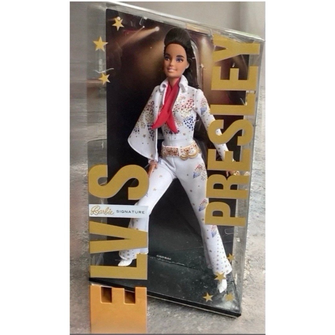 The Mattel Barbie Signature Music Series featuring Elvis Presley is a 12-inch fashion doll with black hair and a light complexion. This Barbie doll, designed by artist Linda Kyaw-Merschon, comes with a display stand and a certificate of authenticity, making it a collectible item for fans of both Barbie and Elvis Presley.